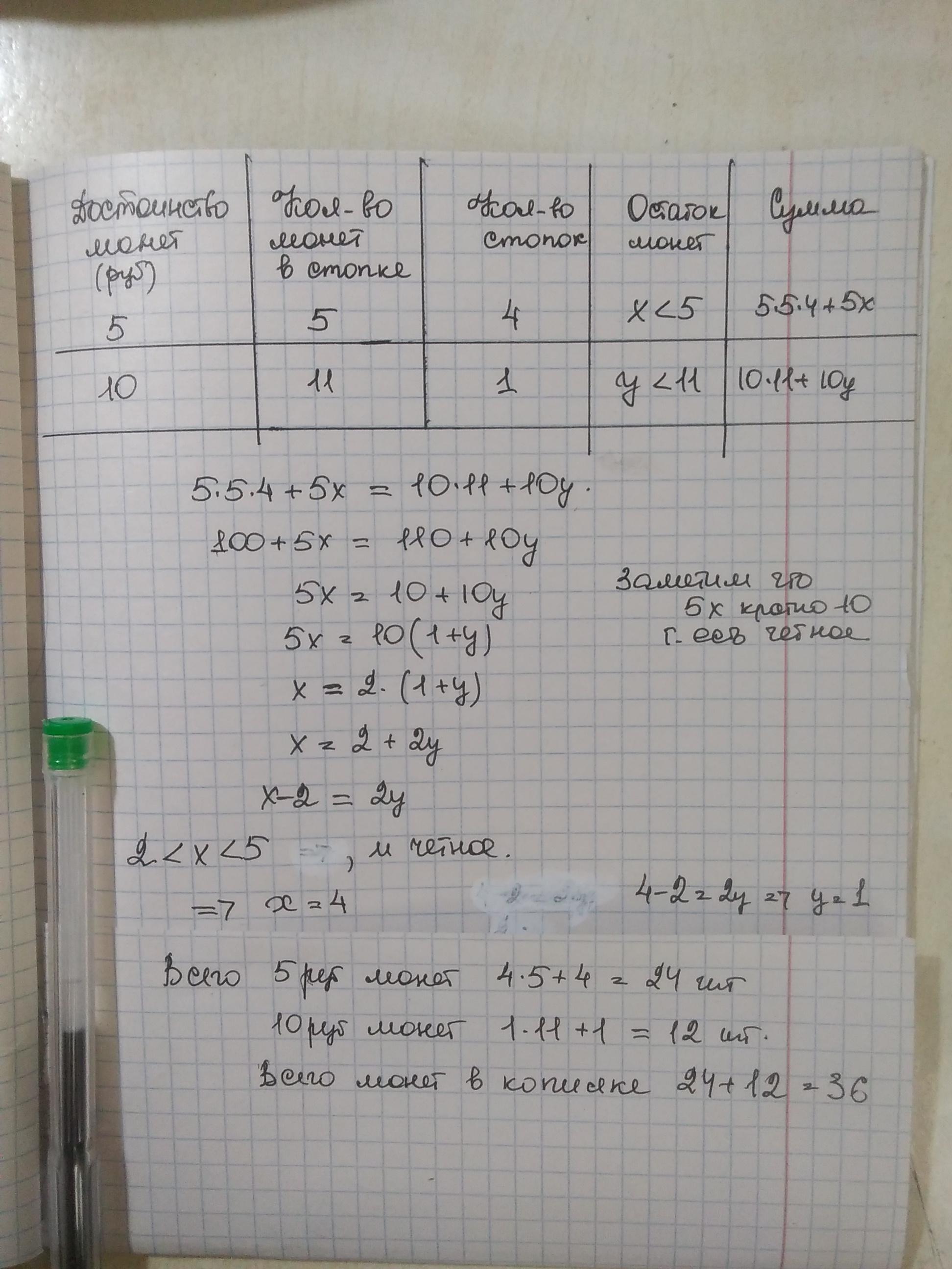 У Димы в копилке лежат монеты по 5 рублей и по 10 рублей. Если все пятирублёвые монеты, которые лежат в копилке, сложить в стопки по 5 монет, то получится четыре полных стопки, а пятая неполная. Если же сложить десятирублёвые монеты в стопки по 11 монет, то получится одна полная стопка, а вторая неполная. Сколько всего рублей у Димы в копилке, если пятирублёвые монеты составляют такую же сумму (в рублях), что и десятирублёвые?