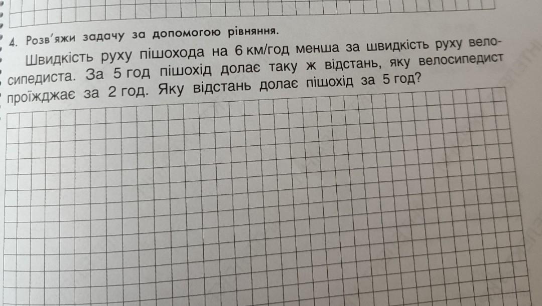 4. Розв'яжи задачу за допомогою рiвняння. Швидкість руху пішохода на 6 км/год менша за швидкість руху вело- сипедиста. За 5 год пішохід долає таку ж відстань, яку велосипедист проїжджає за 2 год. Яку відстань долає пішохід за 5 год? помогите нада до 12:20 здать