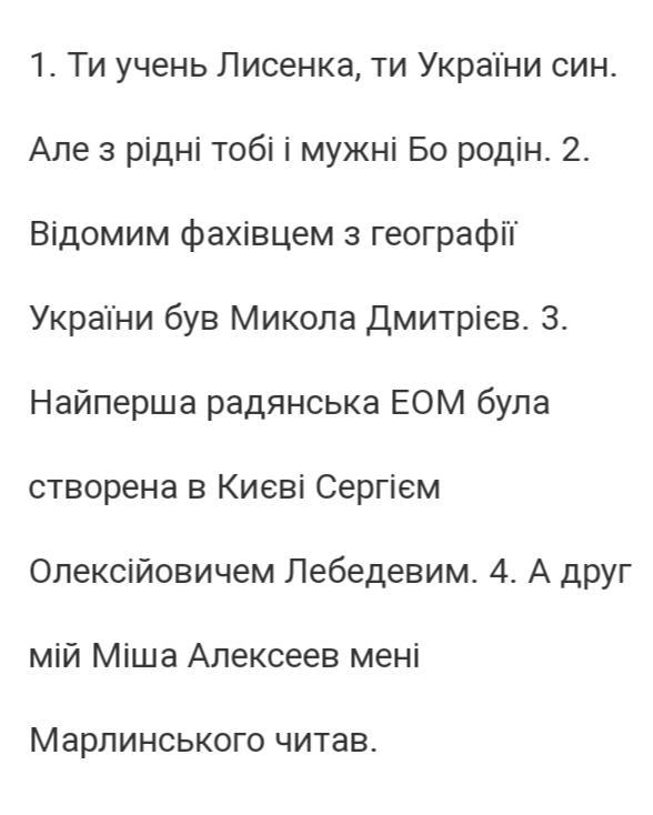 1. Ти учень Лисенка, ти України син. Але з рiднi тобі і мужній Боро- д..н(М.Рильський). 2. Відомим фахівцем з географії України був Мико- ла Дм..трієв(З підручника). 3. Найперша радянська ЕОМ була створена в Києві Сергієм Олексійовичем Л..б..д..вим (з журналу «Інформати- ка та інформаційні технології в навчальних закладах»). 4. А друг мій Миша Ал..кс..Єв мені Марлинського читав (М. Рильський). Склопіт