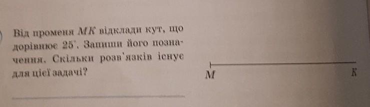 1 Вiд променя МК вiдклади кут, що дорівнює 25. Запиши його позна- чення. Скільки розв'язків існує для цiєї задачі? ПЖ РЕШИТЕ ДАМ 50 баллов