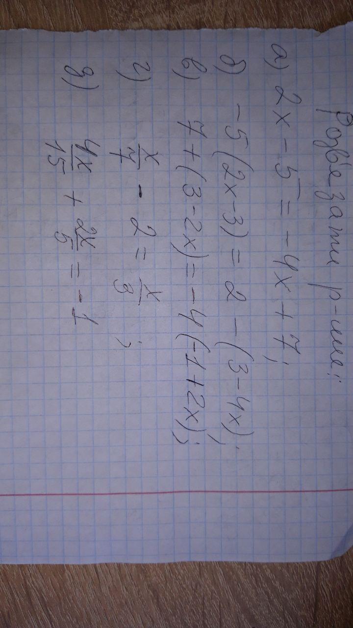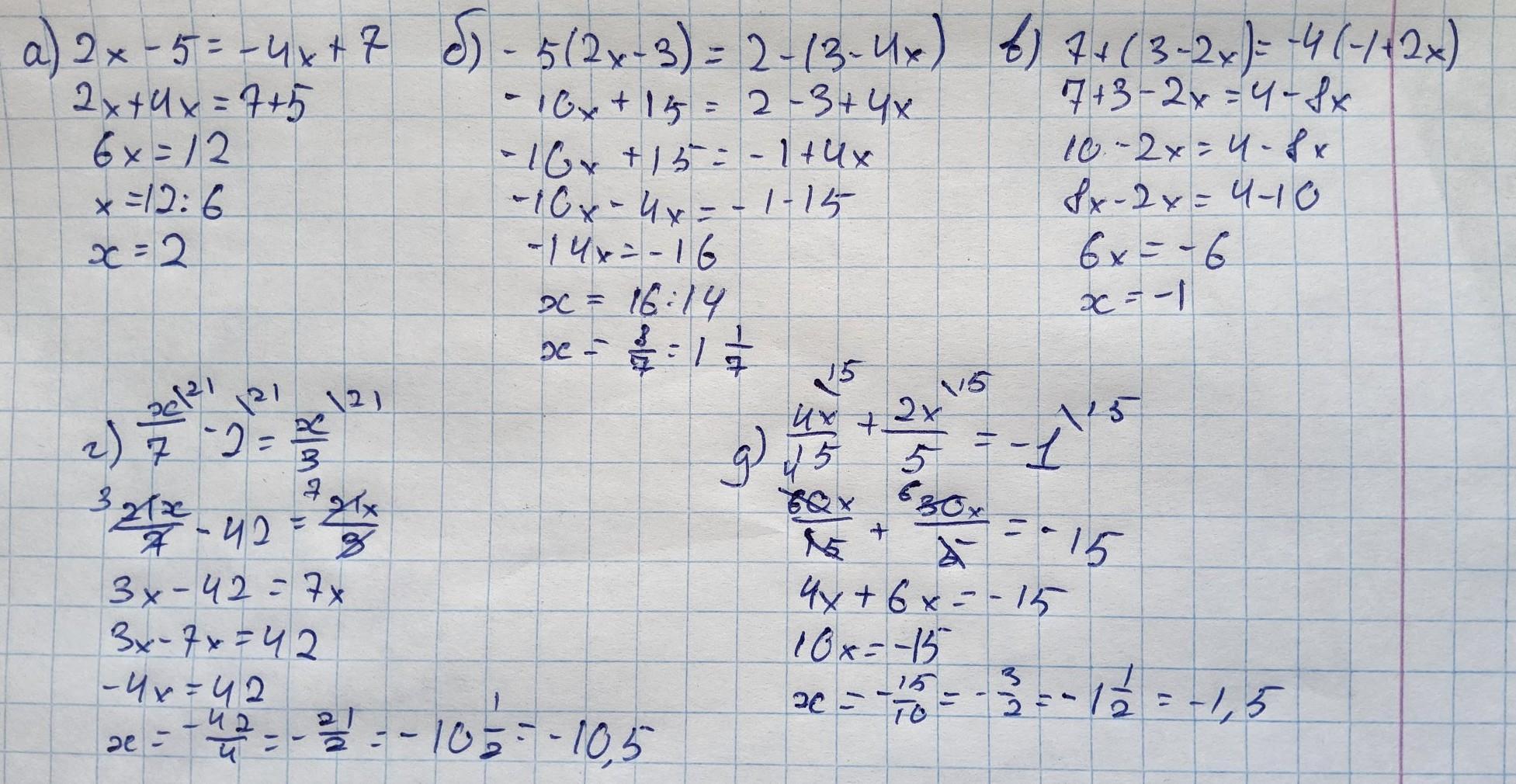 а)х=2. б)х=8/7 не уверен лучше проверь сам. в)17/6. г)х=21/2 д)х=-3/2