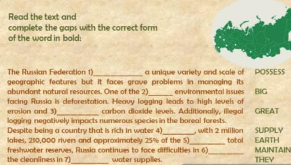The Russian Federation possesses a unique variety and scale of geographic features but It faces grave problems in managing its abundant natural resources, One of the great environmental issues facing Russia is deforestation. Heavy logging leads to high levels of erosion and carbon dioxide levels. Additionally, illegal logging negatively impacts numerous species in the boreal forests. Despite being a country that is rich in water supply, with 2 million lakes, 210,000 rivers and approximately 25% of the earth's total freshwater reserves, Russia continues to face difficulties in maintaining the cleanliness of water supplies.