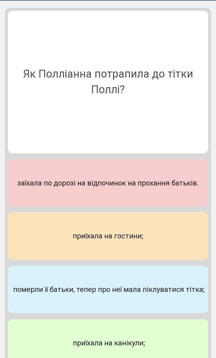 Як Полліанна потрапила до тітки Поллі? заїхала по дорозі на відпочинок на прохання батьків. приїхала на гостини; померли її батьки, тепер про неï мала піклуватися тітка; приїхала на канікули;