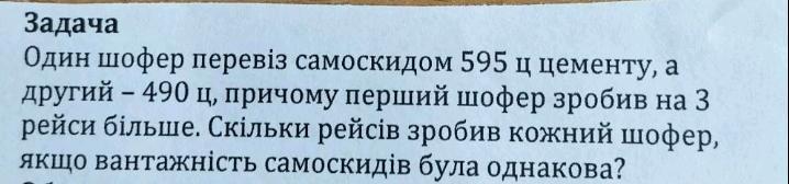 595-490=105 - кількість цементу перевезена за 3 рейси
