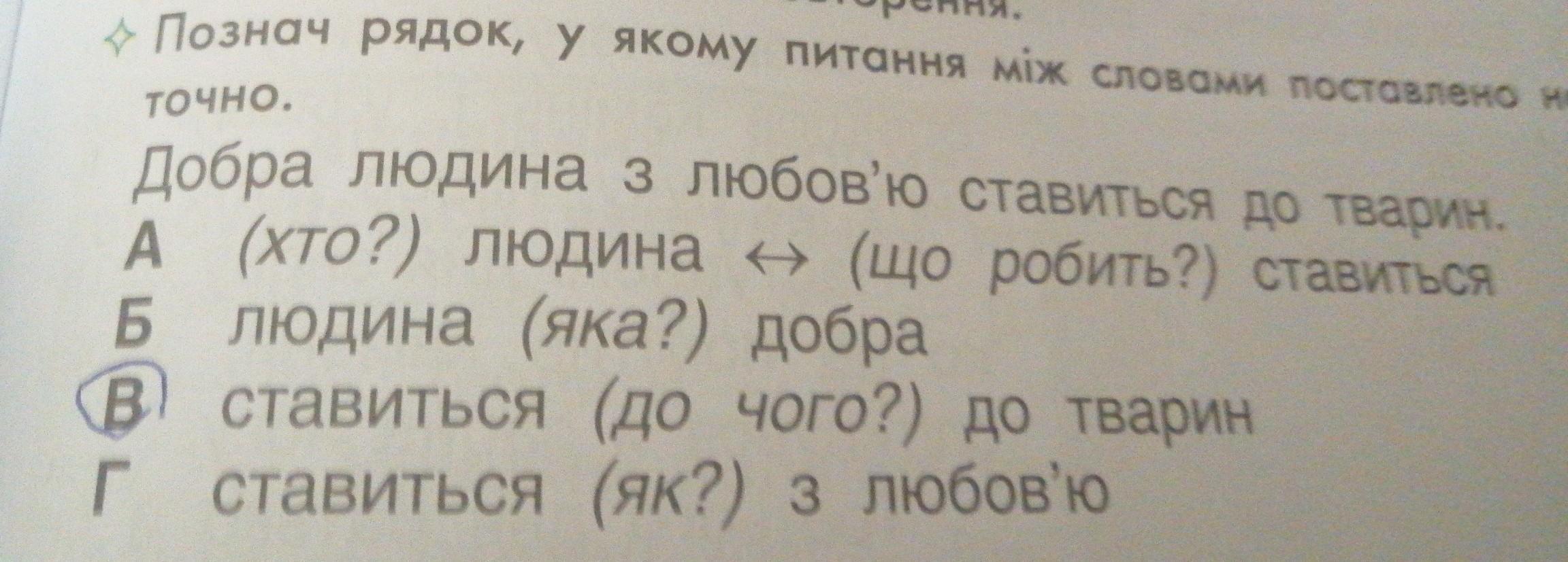 Познач рядок, у якому питання між словами поставлено не- точно. Добра людина з любов'ю ставиться до тварин. А (хто?) людина ⇔ (що робить?) ставиться; Б людина (яка?) добра; В ставиться (до чого?) до тварин; Г ставиться (як?) з любов'ю