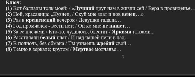 Задание № 2: вставьте на месте (?) недостающие слова в цитаты из баллады В. А. Жуковского «Свет- (1) Вот баллады толк моей: / «(?) друг нам в жизни сей / Вера в провиденье. (2) Пой, красавица Кур нец. / Скуй мне элат и нов (?)...>> (3) раз в (?) вечерок / Девушки гадали... (4) Год промчался - вести нет: Он ко мне (?)... (5) За ее плечами / Кто-то, чудилось, блестит / (?) глазами... (6) Расстилали (?) плат чашей пели в лад... (7) в полночь, без обмана / Ты узнаешь (?) свой... (8) Темно в зеркале; кругом / (?) мол- чанье... (9) Ни полелова ей в ответ: / Он и над глядит на лунный свет, / Бледен и (?)... (10) Едем! Поп уж в церкви ждет/С дьяконом, (?)... (11) Чу!.. в да- ли пустой гремит / Колокольчик (?)... (12) Спасов (?) в ногах стоит: / Свечка пред иконой... (13) Яркий свет паникадил / Тускнет в (?)... (14) (?) гость к крыльцу идет... / Кто?.. Жених Светланы... (15) Вот глядит: к ней в уголок / (?) голубок... (16) у ворот их санки ждут; /С нетерпенья кони рвут / Повода (?)... (17) Кони горопливы / Чутко смотрят в (?) даль. (18) ... кормили / (?) курицу зерном... (19) С треском пыхнул огонек. Крикнул жалобно (?). /Вестник полуночи... Help pls срочно