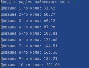 print(f"Довжина {i+1}-го кола: {dovjina:.2f}")