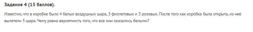 Известно, что в коробке было 4 белых воздушных шара, 3 фиолетовых и 3 розовых. После того как коробка была открыта, из неё вылетели 3 шара. Чему равна вероятность того, что все они оказались белыми?
