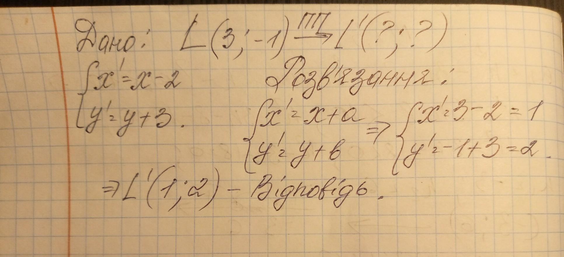 Паралельне перенесення задано формулами х1=х-2 ; у1=у+3. У яку точку при такому паралельному перенесенні перейде точка L (3;-1)?
