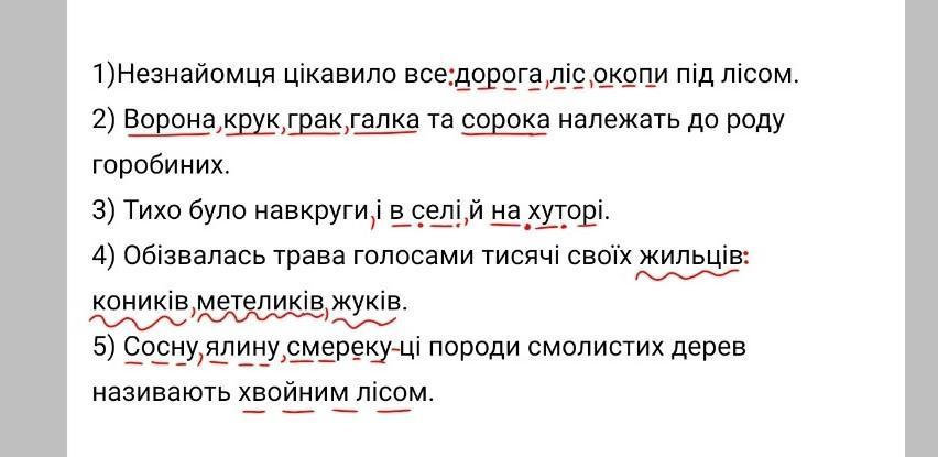 Спиши речення, розстав пропущені розділові знаки, та підкреслити однорідні члени речення та узагальнені слова як члени речення. 1) Незнайомця цікавило все дорога ліс окопи під лісом. 2) Ворона крук грак галка та сорока належать до роду горобиних. 3) Тихо було навкруги і в селі й на хуторі. 4) Обізвалась трава голосами тисячі своїх жильців коників метеликів жуків. 5) Сосну ялину смереку ці породи смолистих дерев називають хвойним лісом.