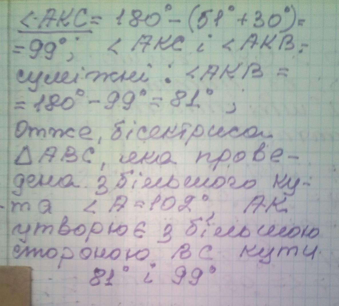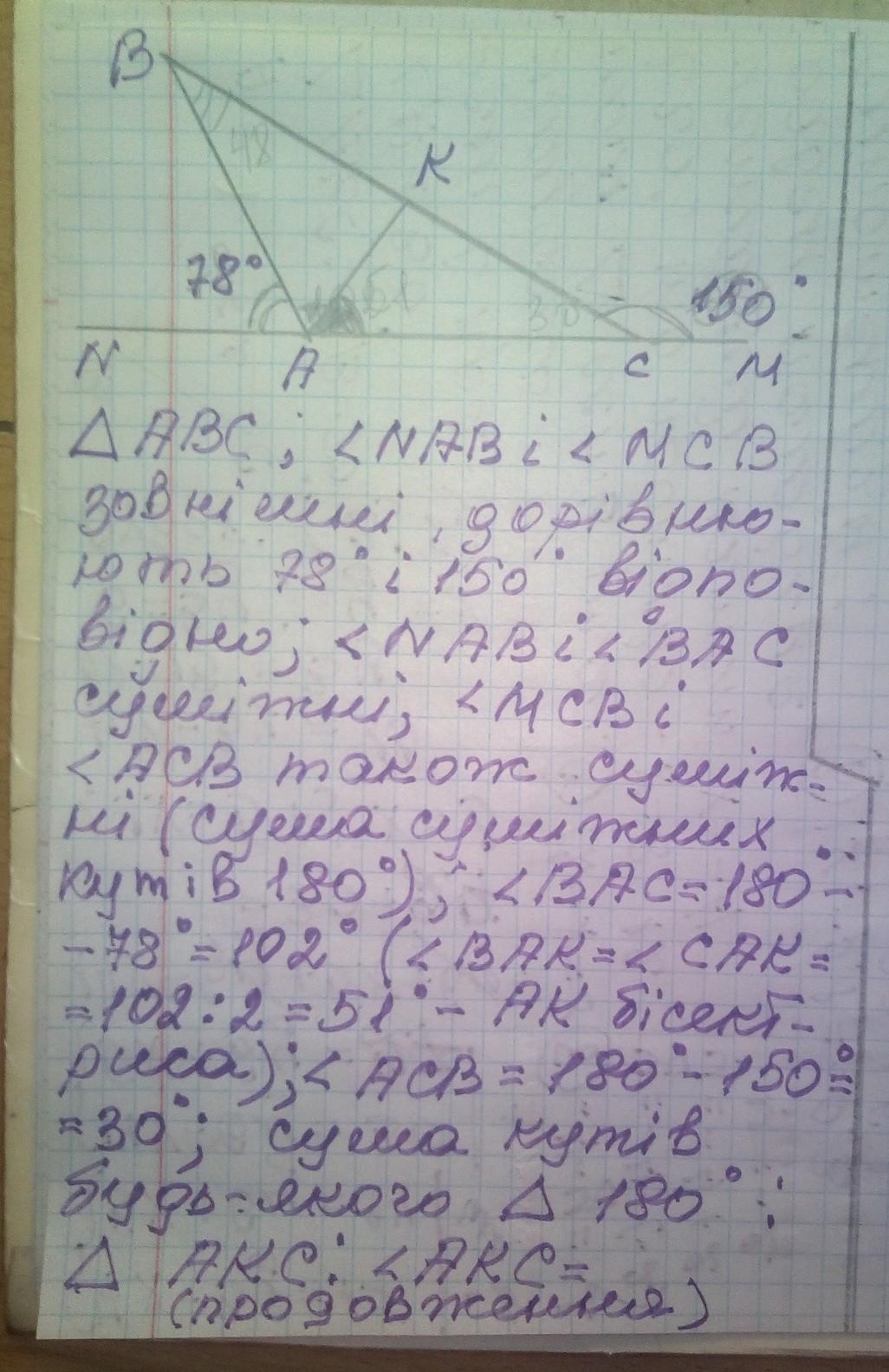Два зовнішні кути трикут ника дорівнюють 150° i 78°. Знайдіть кути, які бісект- риса найбільшого кута три- кутника утворює 3 найбільшою стороною. його найбільшою стороною