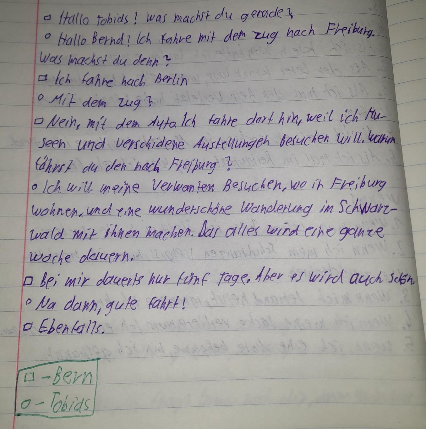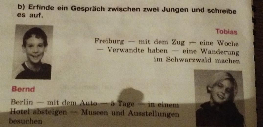 b) Erfinde ein Gespräch zwischen zwei Jungen und schreibe es auf. Tobias Freiburg mit dem Zug eine Woche eine Wanderung - Verwandte haben im Schwarzwald machen - Bernd Berlin mit dem Auto 5 Tage in einem Hotel absteigen Museen und Ausstellungen besuchen - - 84 -
