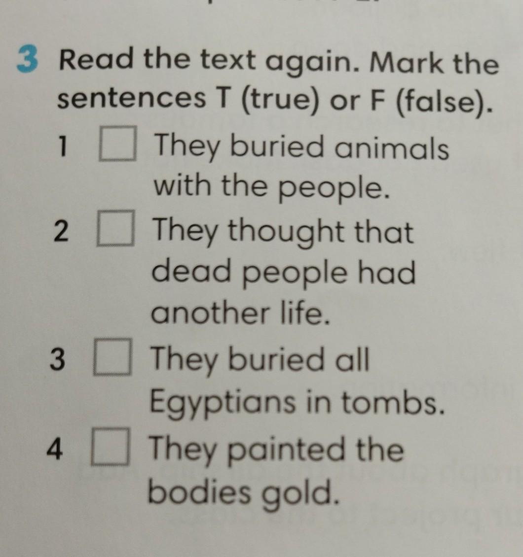 Read the text again. Mark the sentences T (true) or F (false). 1. They buried animals with the people. 2. They thought that dead people had another life. 3. They buried all Egyptians in tombs. 4. They painted the bodies gold. ПОЖАЙЛУСТА ПОМОГИТЕ