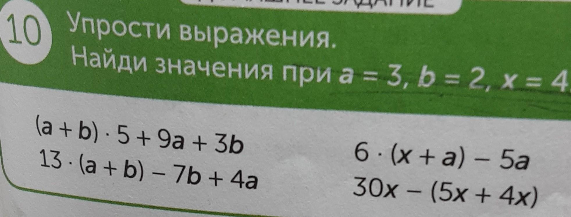 Найди значения при а = 3, 5 = 2, x = 4. (a + b) . 5 + 9а + 3b 13 - (a + b) - 7b + 4 6 . (x + a) - 5a 30x - (5x + 4x) - с