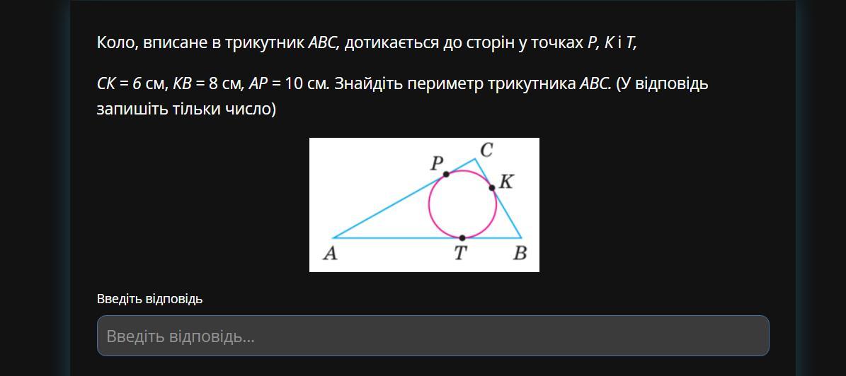 СК = 6 см, КВ = 8 см, АР = 10 см. Знайдіть периметр трикутника АВС. (У відповідь запишіть тільки число)