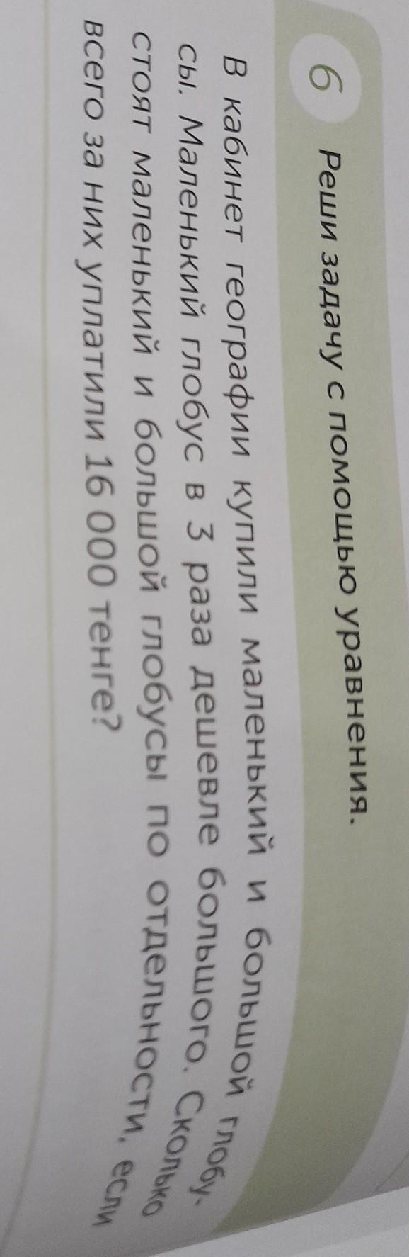 6 Реши задачу с помощью уравнения в кабинет географии купили маленький и большой поty стоит маленький и большой глобусы по отдельности, если см Маленький глобус в 4 раза дешевле большого. Сколько всего за них уплатили 16 000 тенге? и можно сфоткатб