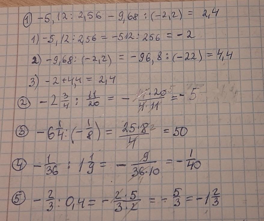 -2/3 : 0,4 = -2/3 : 4/10 = -2/3 * 10/4 = -20/12 = -5/3 = -1 2/3