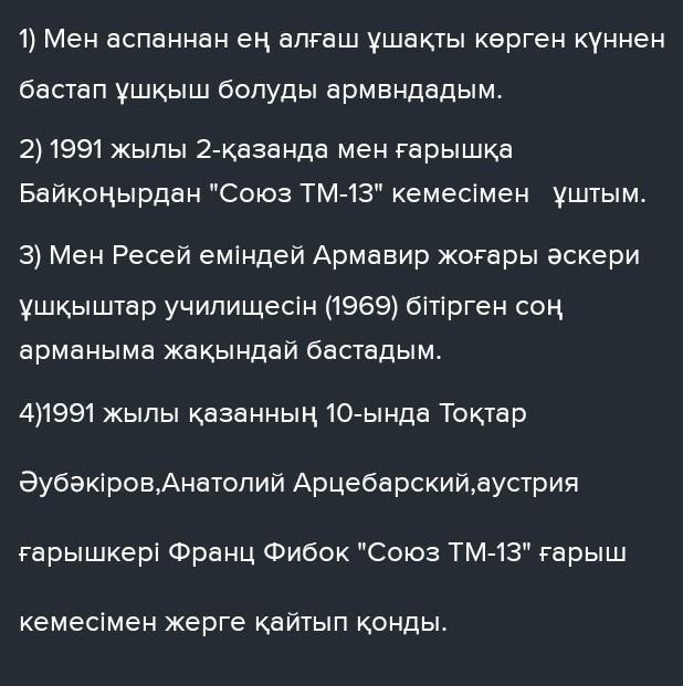 3. Сұрақтарға мәтіннен жауап тауып айт. Тоқтар ағаның ұшқыш болу арманы неден басталды? Ғарышкердің есінде қалған ең тамаша сәті қай кез еді? Тоқтар Әубәкіровтің арманы қашан орындала бастады? Ғарышкер ғарышқа қашан және қай жерден ұшты?