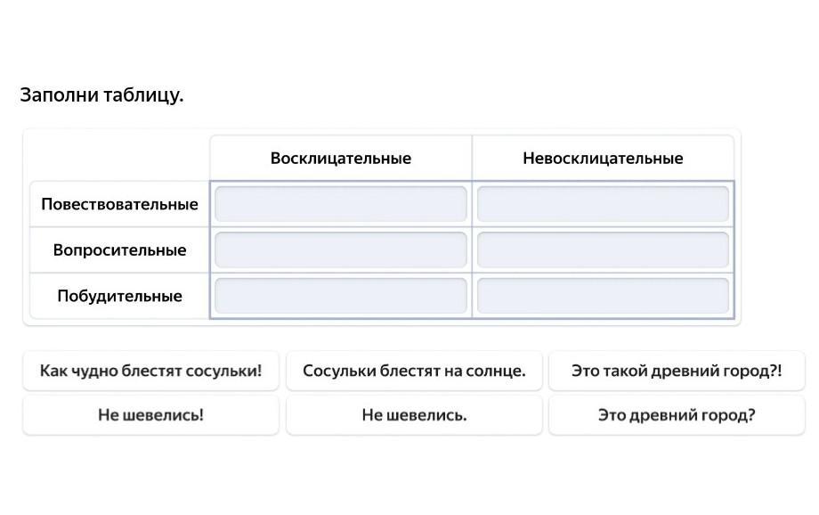 Заполни таблицу. Повествовательные Вопросительные Побудительные Как чудно блестят сосульки! Не шевелись! восклицательные Невосклицательные Сосульки блестят на солнце. Не шевелись. Это такой древний город?! Это древний город?
