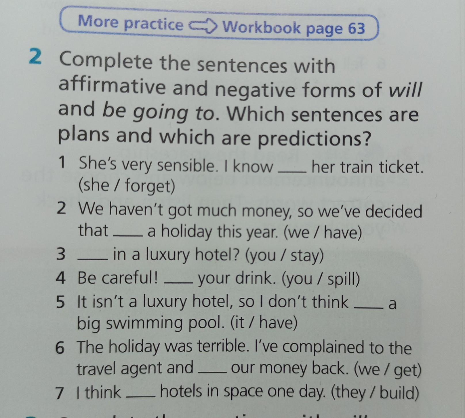2.Complete the sentences with affirmative and negative forms of will and be going to. Which sentences are plans and which are predictions?