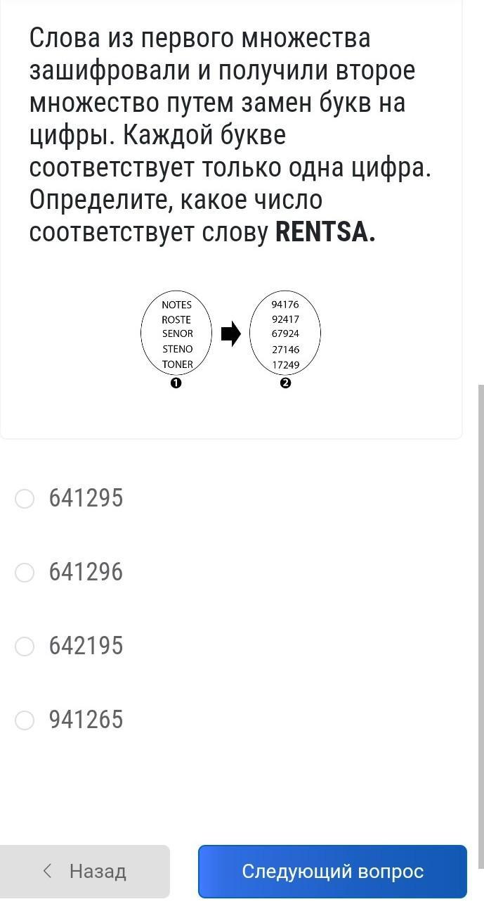 Слова из первого множества зашифровали и получили второе множество путем замен букв на цифры. Каждой букве соответствует только одна цифра. Определите, какое число соответствует слову RENTSA.