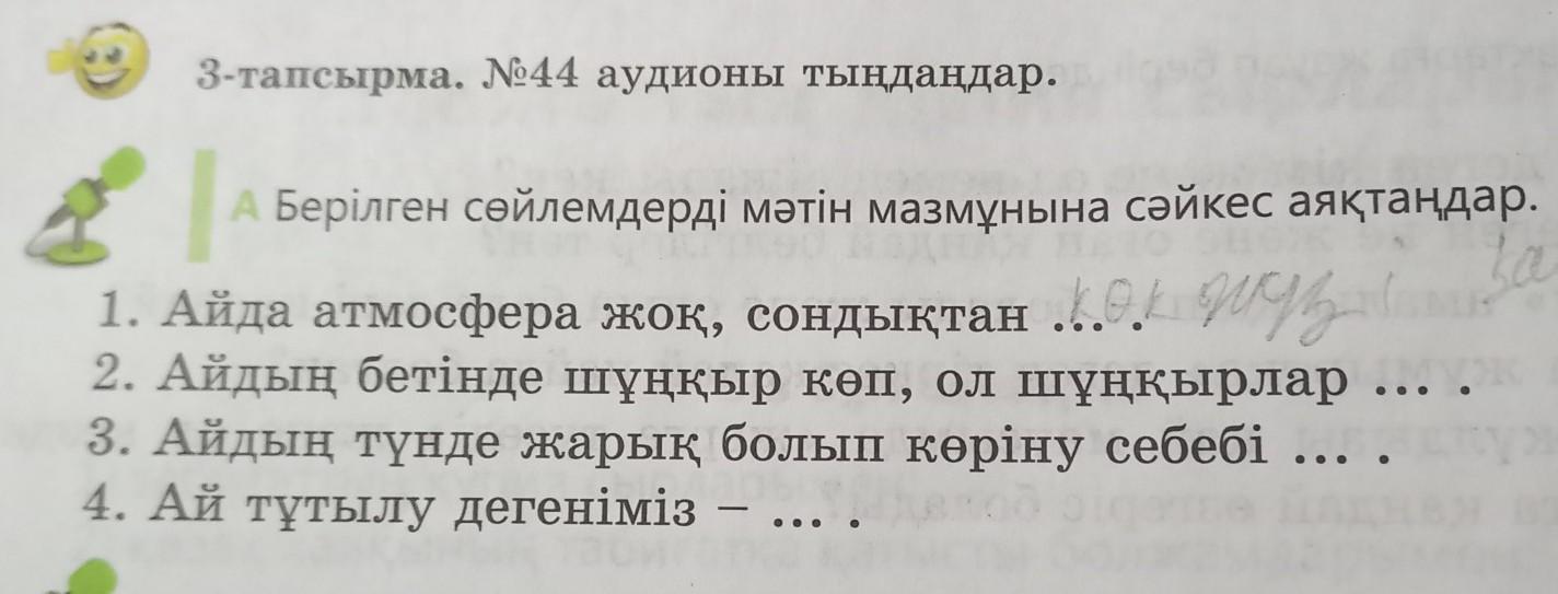 да А Берілген сөйлемдерді мәтін мазмұнына сәйкес аяктандар. 1. Айда атмосфера жок, сондыктан ... 2. Айдын бетiнде шункыр кеп, ол шұңқырлар 3. Айдың түнде жарык болып көріну себебі ... 4. Ай тұтылу дегенiмiз - ...
