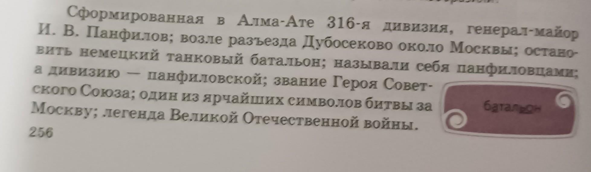 И. В. Панфилов; возле разъезда Дубосеково около Москвы: остан Сформированная в Алма-Ате 316-я дивизия, генерал-майо ВИТЬ Немецкий танковый батальон; называли себя панфиловцами а дивизию-панфиловской; звание Героя Совет- ского Союза; один из ярчайших символов битвы за Москву; легенда Великой Отечественной войны. 256 батальон