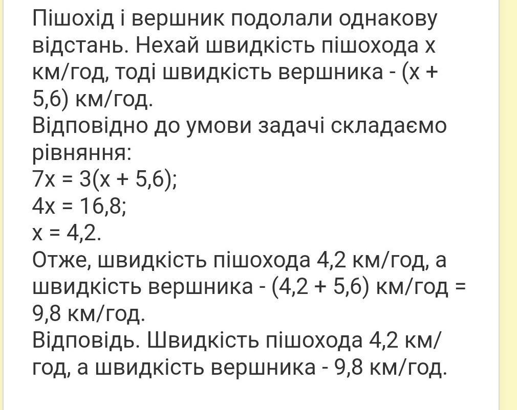 пішохід подолав відстань між двома селищами за 7 год,а вершник-за 3 год.Знайдіть швидкості пішохода та вершника, якщо швидкість пішохода на 5.6 км/год менша від швидкості вершника.