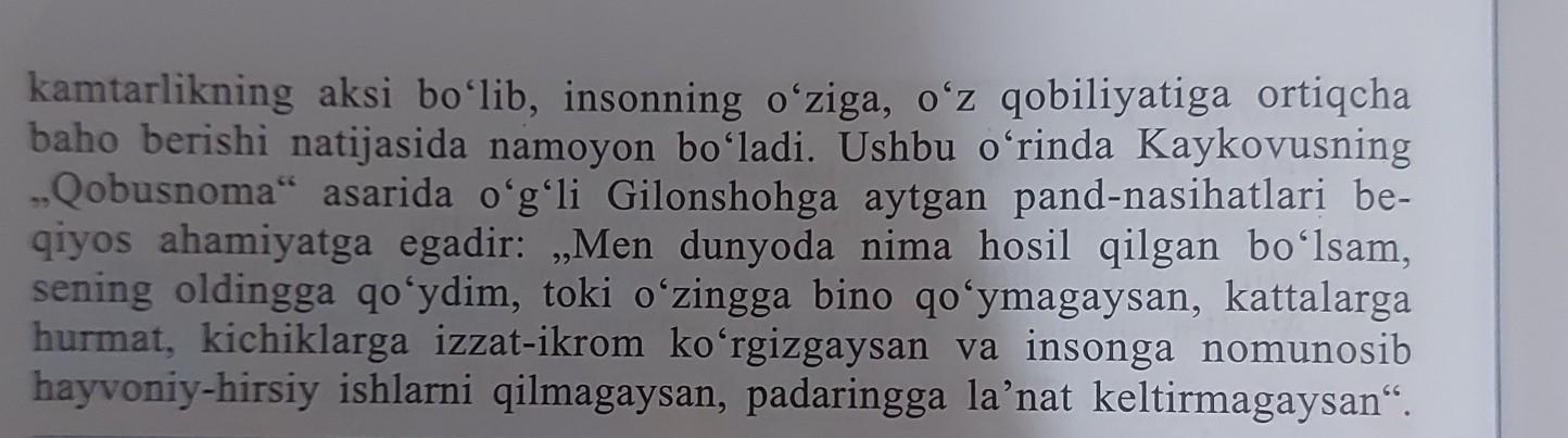 Matn yuzasidan topshiriqlar 1. Odob, kamtarlik so'zlarini qanday tushunasiz. 2. Kaykovusning ,,Qobusnoma" asarida aytilgan pand-nasihatlarni izohlang. 3. Matndan kamtarlik so'zining qarama-qarshi ma'nosini bildiruvchi so'zni topib izohlang.