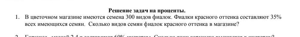 1. В цветочном магазине имеются семена 300 видов фиалок. Фиалки красного оттенка составляют 35% всех имеющихся семян. Сколько видов семян фиалок красного оттенка в магазине?