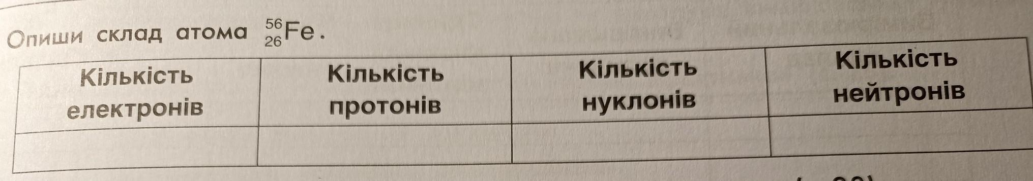 Опиши склад атома Кiлькiсть 56 Fe. 26 кількість електронів, протонів,нуклонів,нейтронів ДАЮ 80 БАЛІВ
