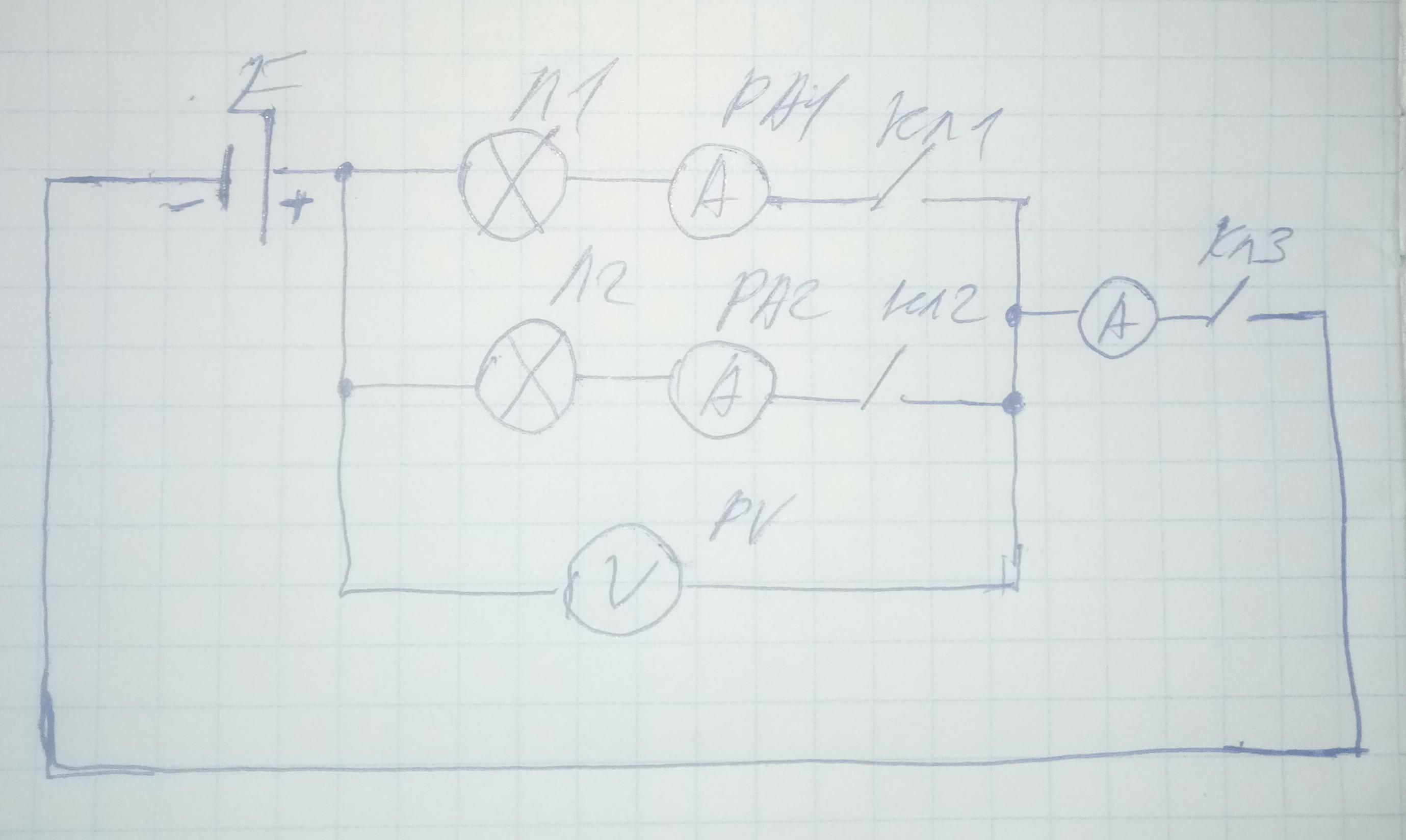 Накреслити схему електричного поля ,яке складається з гальванічного елемента, двох лама ,трьох ключів та трьох амператорів.Амператори вимірюють силу струму окремо на кожній лампі ,та у всьому колі: вольтметр вимірює напругу на двох лампочка одночасно при чому кожна лампа вимикається своїм ключем, атретій ключ вимикає дві лампи одночасно.