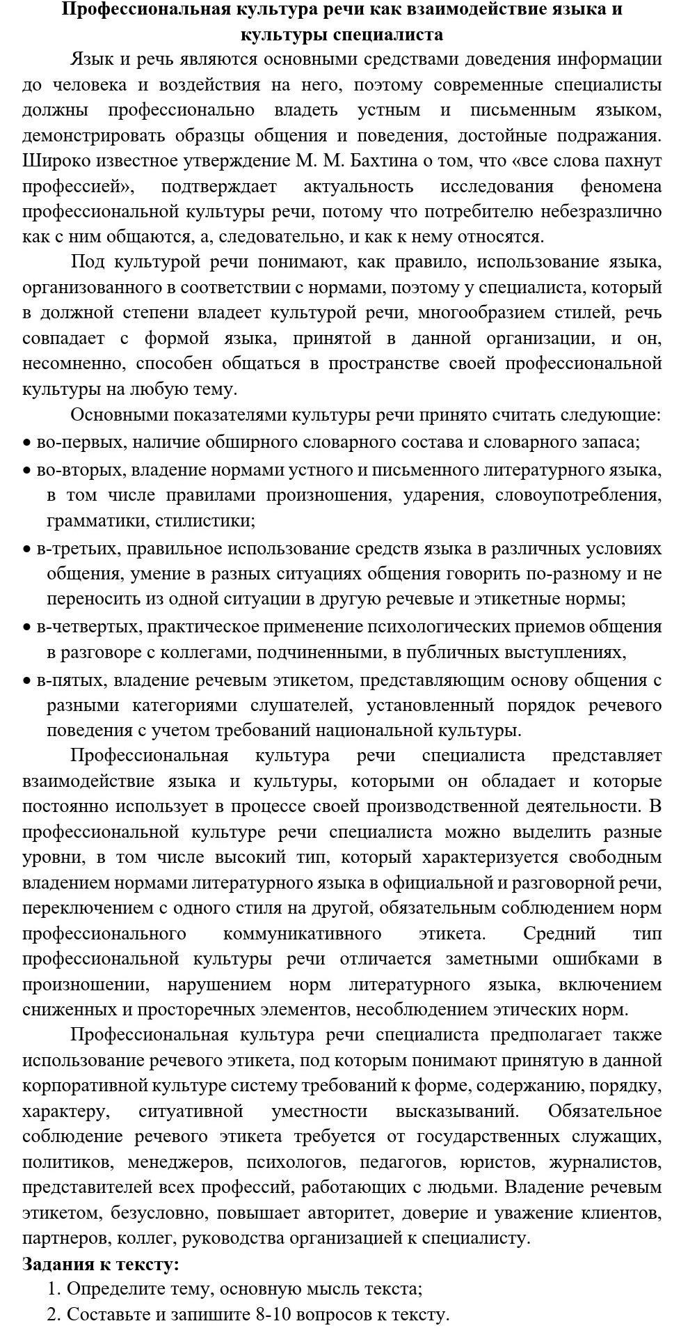 Профессиональная культура речи как взаимодействие языка и культуры специалиста Язык и речь являются основными средствами доведения информации до человека и воздействия на него, поэтому современные специалисты должны профессионально владеть устным и письменным ЯЗЫКОМ, демонстрировать образцы общения и поведения, достойные подражания. Широко известное утверждение М. М. Бахтина о том, что «все слова пахнут профессией», подтверждает актуальность исследования феномена профессиональной культуры речи, потому что потребителю небезразлично как с ним общаются, а, следовательно, и как к нему относятся. Под культурой речи понимают, как правило, использование языка, организованного в соответствии с нормами, поэтому у специалиста, который в должной степени владеет культурой речи, многообразием стилей, речь совпадает с формой языка, принятой в данной организации, и он, несомненно, способен общаться в пространстве своей профессиональной культуры на любую тему. Основными показателями культуры речи принято считать следующие: • во-первых, наличие обширного словарного состава и словарного запаса; • во-вторых, владение нормами устного и письменного литературного языка, в том числе правилами произношения, ударения, словоупотребления, грамматики, стилистики; • в-третьих, правильное использование средств языка в различных условиях общения, умение в разных ситуациях общения говорить по-разному и не переносить из одной ситуации в другую речевые и этикетные нормы; • в-четвертых, практическое применение психологических приемов общения в разговоре с коллегами, подчиненными, в публичных выступлениях, • в-пятых, владение речевым этикетом, представляющим основу общения с разными категориями слушателей, установленный порядок речевого поведения с учетом требований национальной культуры. Профессиональная культура речи специалиста представляет взаимодействие языка и культуры, которыми он обладает и которые постоянно использует в процессе своей производственной деятельности. В профессиональной культуре речи специалиста можно выделить разные уровни, в том числе высокий тип, который характеризуется свободным владением нормами литературного языка в официальной и разговорной речи, переключением с одного стиля на другой, обязательным соблюдением норм профессионального коммуникативного этикета. Cpeдний тип профессиональной культуры речи отличается заметными ошибками в произношении, нарушением норм литературного языка, включением сниженных и просторечных элементов, несоблюдением этических норм. Профессиональная культура речи специалиста предполагает также использование речевого этикета, под которым понимают принятую в данной корпоративной культуре систему требований к форме, содержанию, порядку, характеру, ситуативной уместности высказываний. Обязательное соблюдение речевого этикета требуется от государственных служащих, политиков, менеджеров, психологов, педагогов, юристов, журналистов, представителей всех профессий, работающих с людьми. Владение речевым этикетом, безусловно, повышает авторитет, доверие и уважение клиентов, партнеров, коллег, руководства организацией к специалисту. Задания к тексту: 1. Определите тему, основную мысль текста; 2. Составьте и запишите 8-10 вопросов к тексту.