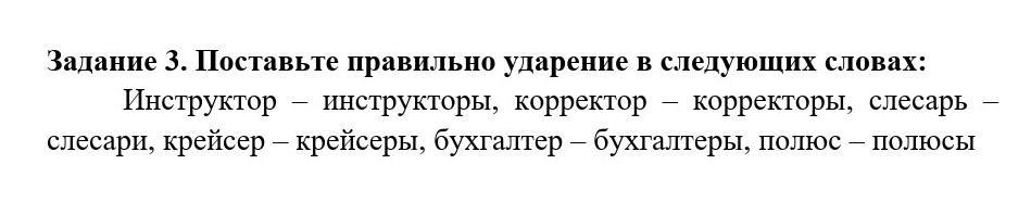 Задание 3. Поставьте правильно ударение в следующих словах: Инструктор инструкторы, корректор корректоры, слесарь слесари, крейсер – крейсеры, бухгалтер – бухгалтеры, полюс - полюсы -