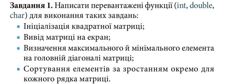 Написати перевантажені функції (int, double, char) для виконання таких завдань: Ініціалізація квадратної матриці; Вивід матриці на екран; - Визначення максимального й мінімального елемента на головній діагоналі матриці; Сортування елементів за зростанням окремо для кожного рядка матриці.c++,написати код,щоб був легкий і зрозумілий
