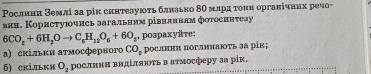 80 млрд тонн * 6 атомів С / 1 молекулу глюкози * 1 моль глюкози / 180 г = 1,6 * 10¹² моль С