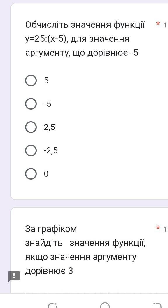 Обчисліть значення функції y=25:(x-5), для значення аргументу, що дорівнює -5 * 1 балл