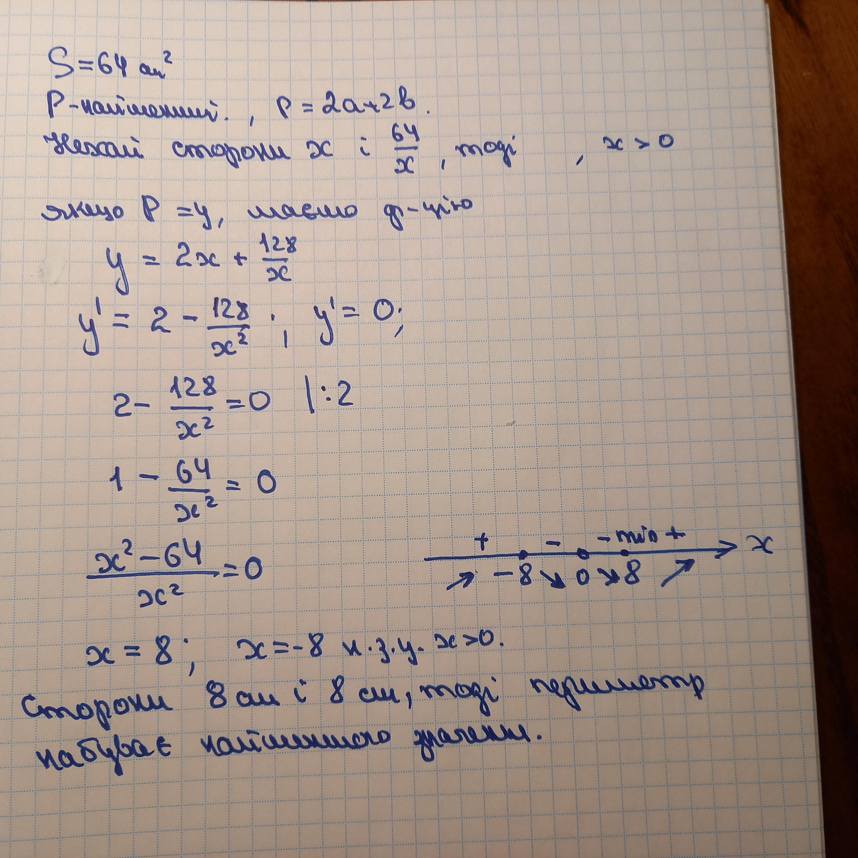 Площа прямокутника дорівнює 64 см^2. Якої довжини мають бути його сторони щоб периметр прямокутника був найменшим?