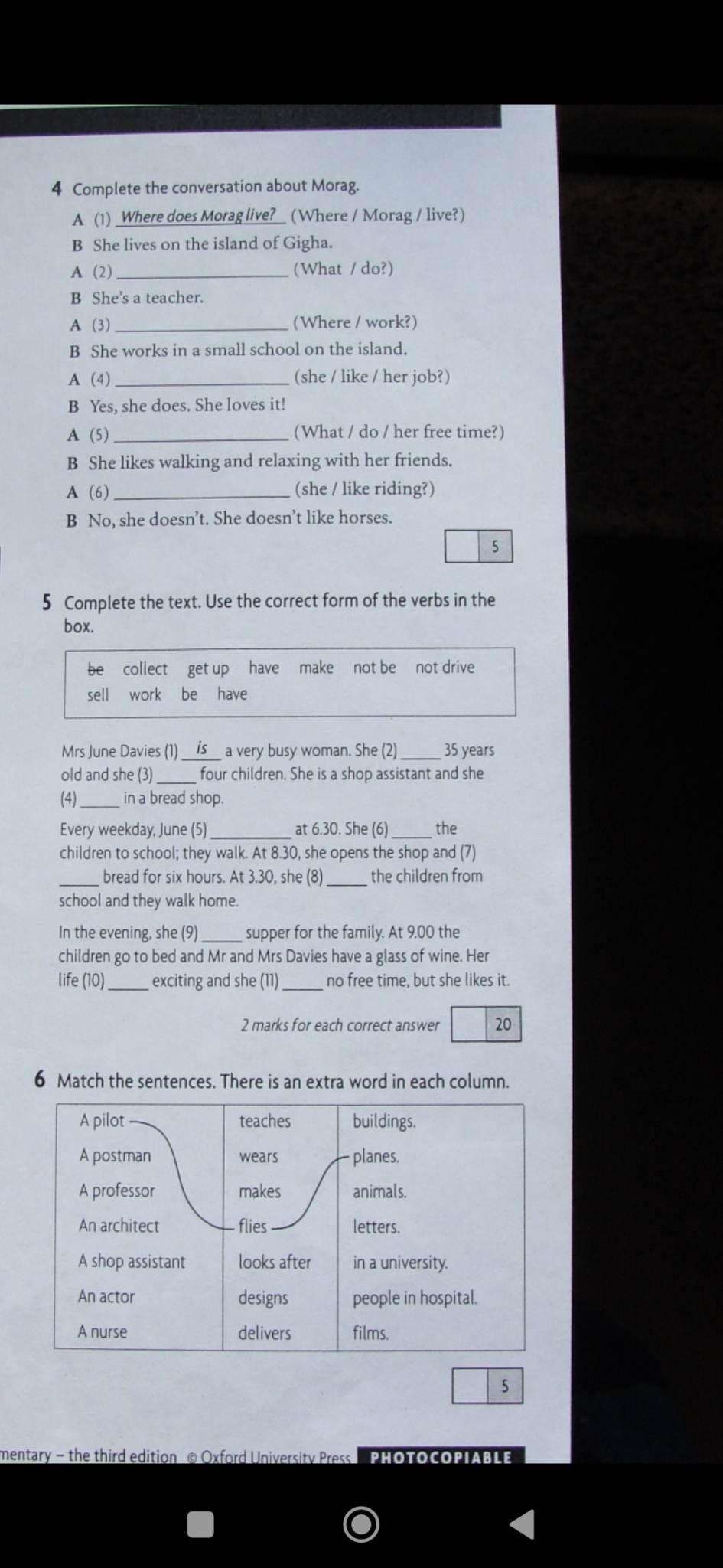 Mrs June Davies is a very busy woman. She is 35 years old and she has four children. She works as a shop assistant and she works in a bread shop. Every weekday, June gets up at 6.30. She does not drive the children to school; they walk. At 8.30, she opens the shop and makes bread for six hours. At 3.30, she collects the children from school and they walk home. In the evening, she makes supper for the family. At 9.00 the children go to bed and Mr and Mrs Davies have a glass of wine. Her life is not exciting and she does not have free time, but she likes it.