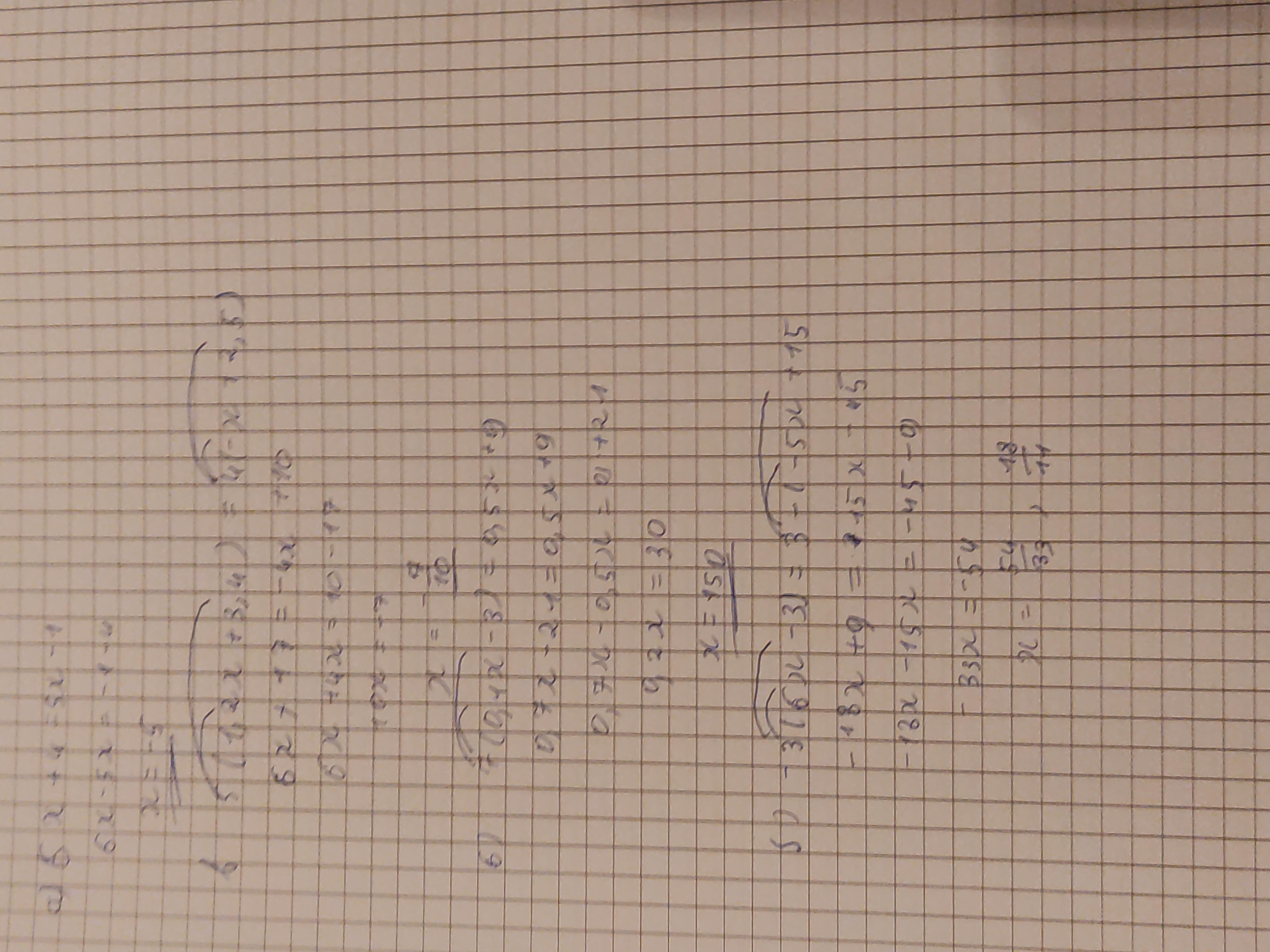в) 5(1,2x + 3,4) = 4(–x + 2,5);