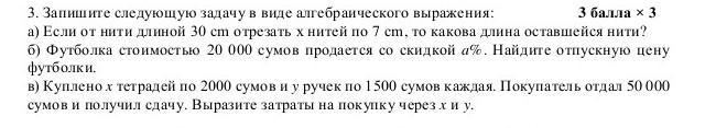 3. Запишите следующую задачу в виде алгебраического выражения: 3 балла х 3 а) Если от нити длиной 30 см отрезать ч нитей по 7 cm, то какова длина оставшейся нити? б) Футболка стоимостью 20 000 сумов продается со скидкой ф%. Найдите отпускную цену футболки. в) Куплено х тетрадей по 2000 сумов и у ручек по 1500 сумов каждая. Покупатель отдал 50 000 сумов и получил сдачу. Выразите затраты на покупку через х и у.