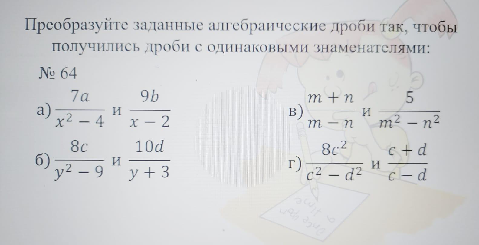 Преобразуйте заданные алгебраические дроби так, чтобы получились дроби с одинаковыми знаменателями: № 64