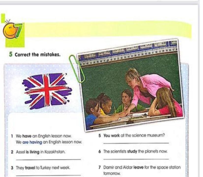 5 Correct the mistakes. 1 We have an English lesson now. We are having an English lesson now. 2 Assel is living in Kazakhstan, 3 They travel to Turkey next week. 10 5 You work at the science museum? 6 The scientists study the planets now. 7 Damir and Aidar leave for the space station tomorrow.