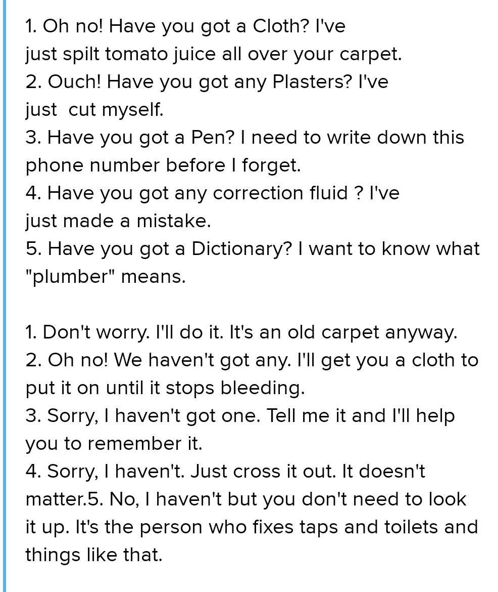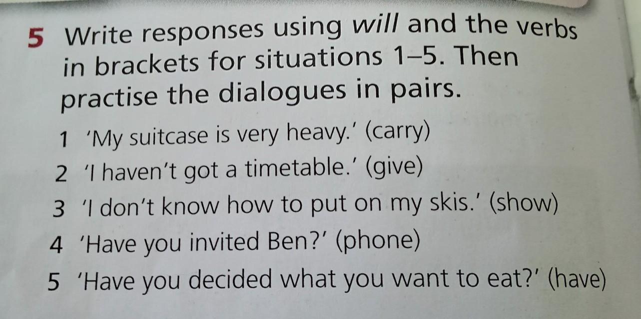 5 Write responses using will and the verbs in brackets for situations 1-5. Then practise the dialogues in pairs. 1 'My suitcase is very heavy.' (carry) 2 'I haven't got a timetable.' (give) 3 'I don't know how to put on my skis.' (show) 4 'Have you invited Ben?' (phone) 5 'Have you decided what you want to eat?' (have)