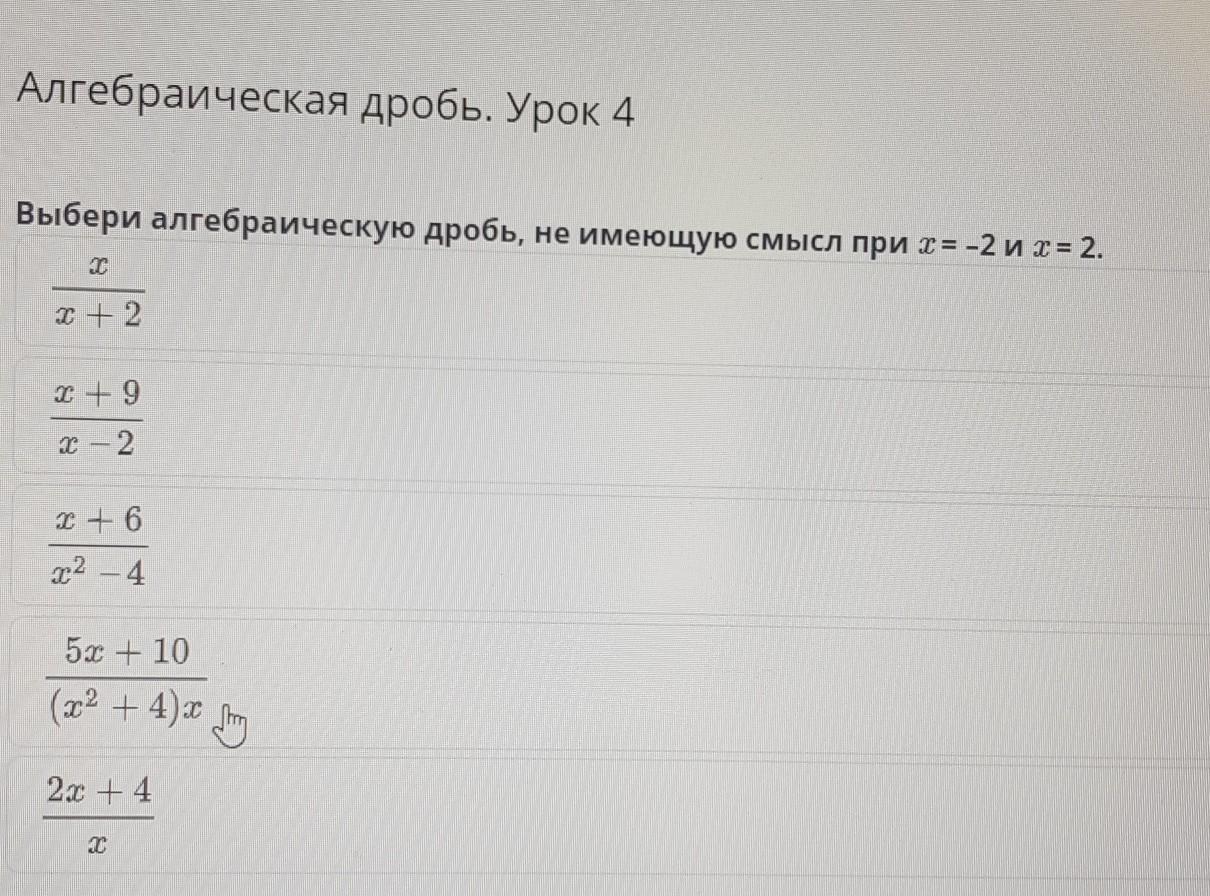 Выбери алгебраическую дробь, не имеющую смысл при х=-2 их = 2. 52+10 (x² + 4)x 8 ЮС x + 2 x + 6 x2 - 4 2x + 4 8 x +9 C- 2