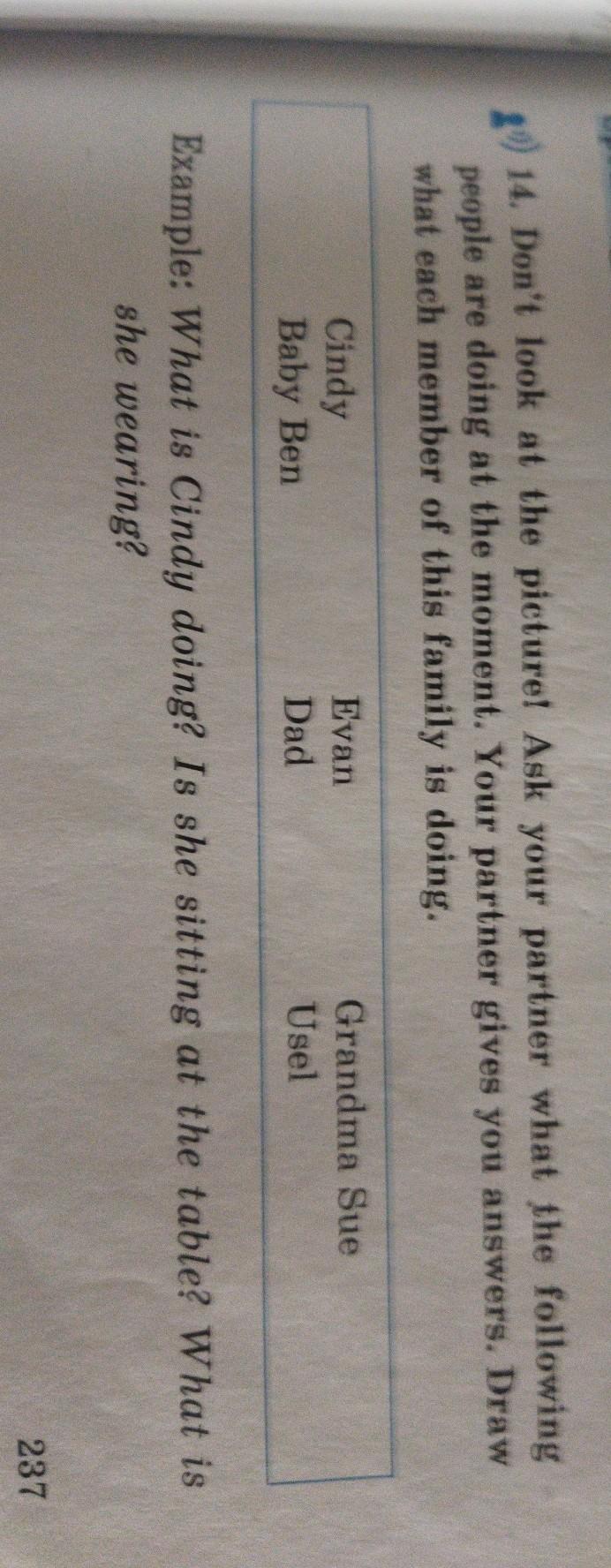 не дивись на картинку!Запитай партнера что в данный момент роблять на ступні Люды. Ваш Партнер дает вам відповіді. Намалюй що робить кожен член цієї семьи.Синди беби Бен. Еван тато Бабуся Сью Усел.Приклад: що робить Сінді?вона сидить за столом? що вона одягнена.Це точно правильно!!!!