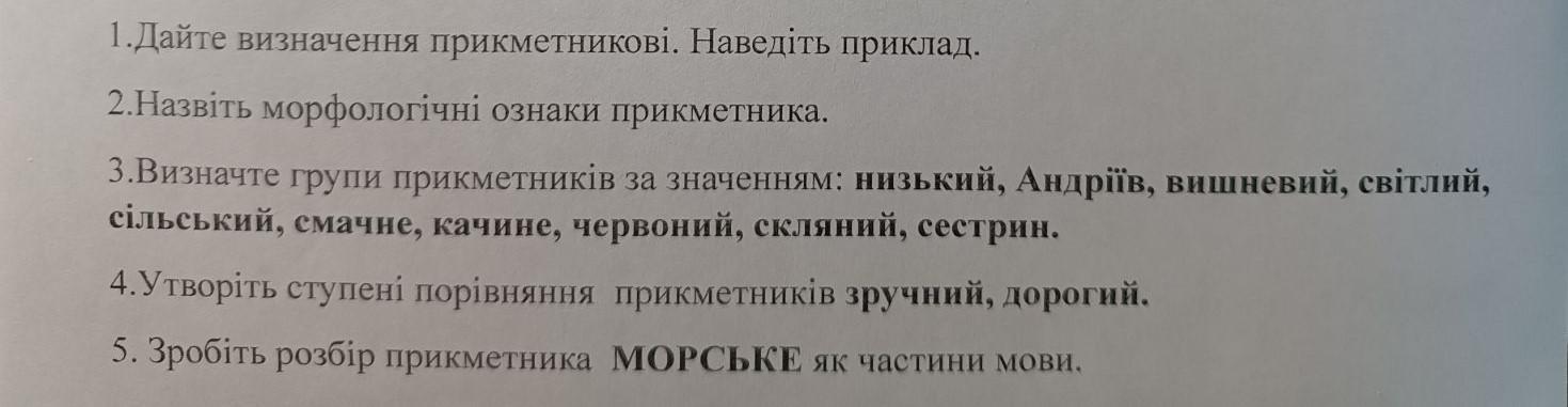 1. Прикметник - це частини мови, яка описує якусь ознаку або властивість іменника. Приклад: "Великий будинок стоїть на вулиці" прикметником є слово "великий", яке описує ознаку будинку - його розмір.