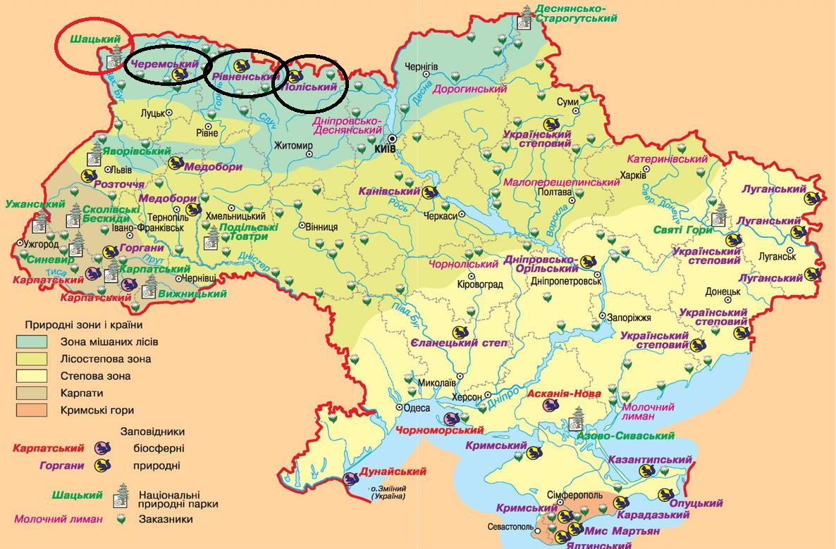 в) Шацький національний природний парк розташован на Волині та у Поліссі, в басейні Західного Бугу