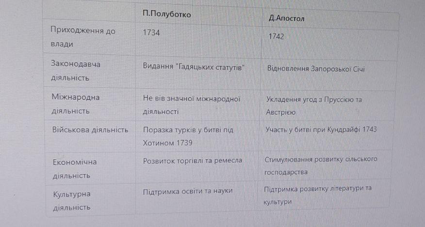 Відповідь:Таблиця порівняння діяльності гетьманів П.Полуботка та Д.Апостола: