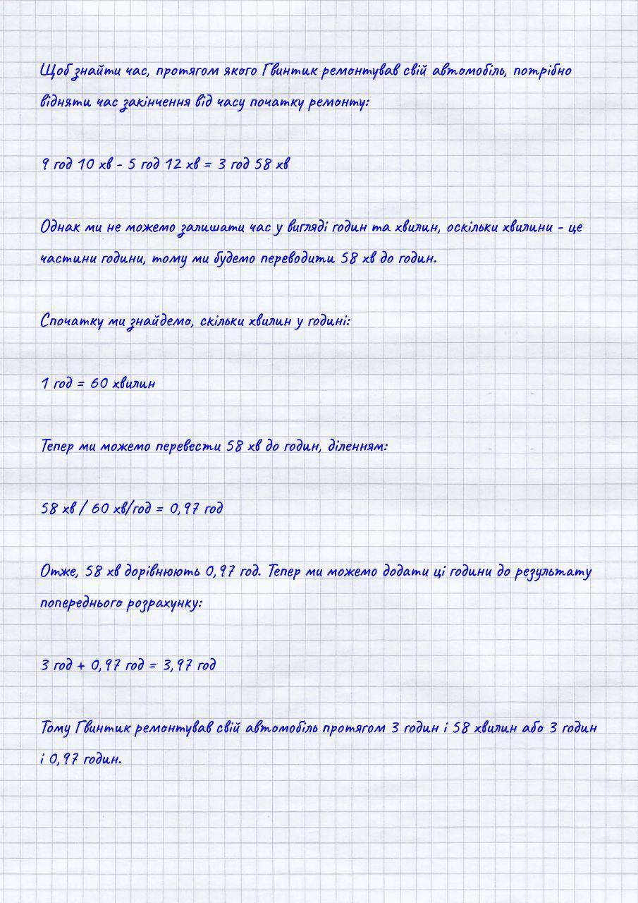 Гвинтик почав ремонт свого автомобіля о 5 год 12 хв, а закінчив о 9 год 10 хв.Скільки часу він ремонтував автомобіль?